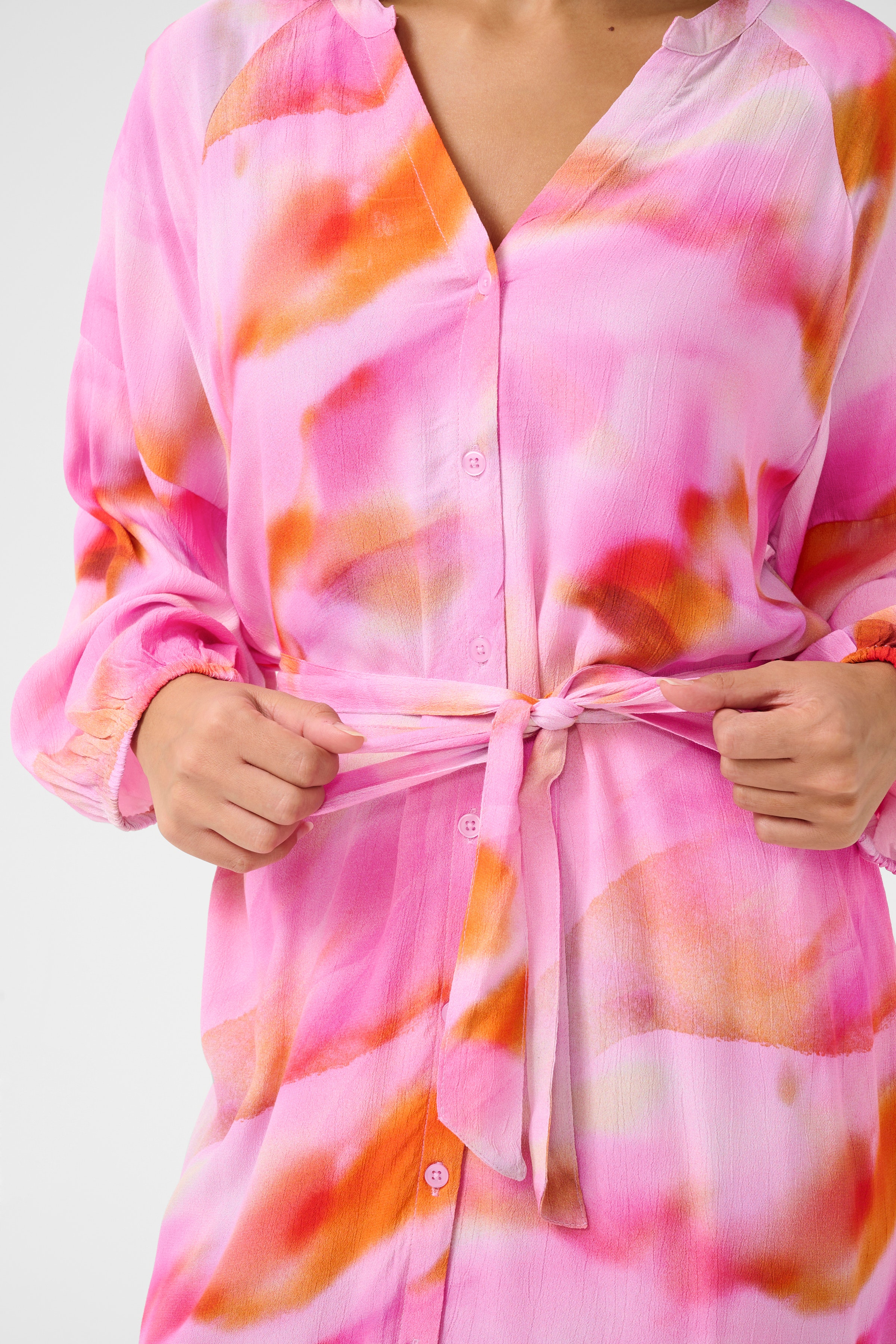Skjortekjole med afslappet pasform, V-udskæring, lange ærmer og knapper foran. Bindebælte i taljen giver en flatterende silhuet. Let materiale sikrer komfort og bevægelsesfrihed. Modellen er 170 cm høj og er iført en størrelse 36.