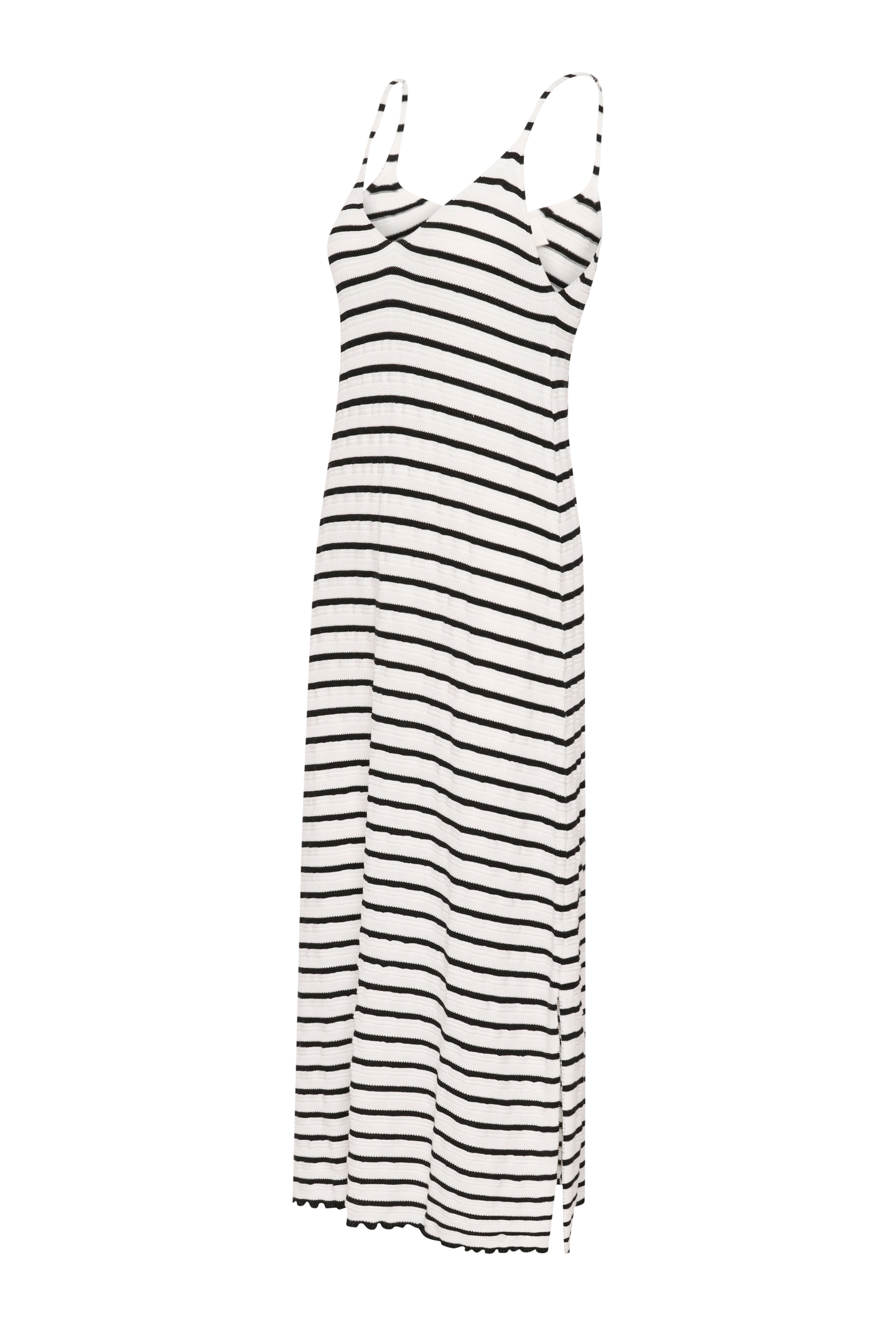 Gestreiftes Maxikleid mit V-Ausschnitt, schmalen Trägern und Seitenschlitz. Aus weichem, elastischem Strick für entspannten Tragekomfort an warmen Tagen. Das Modell ist 170 cm groß und trägt eine Größe S.