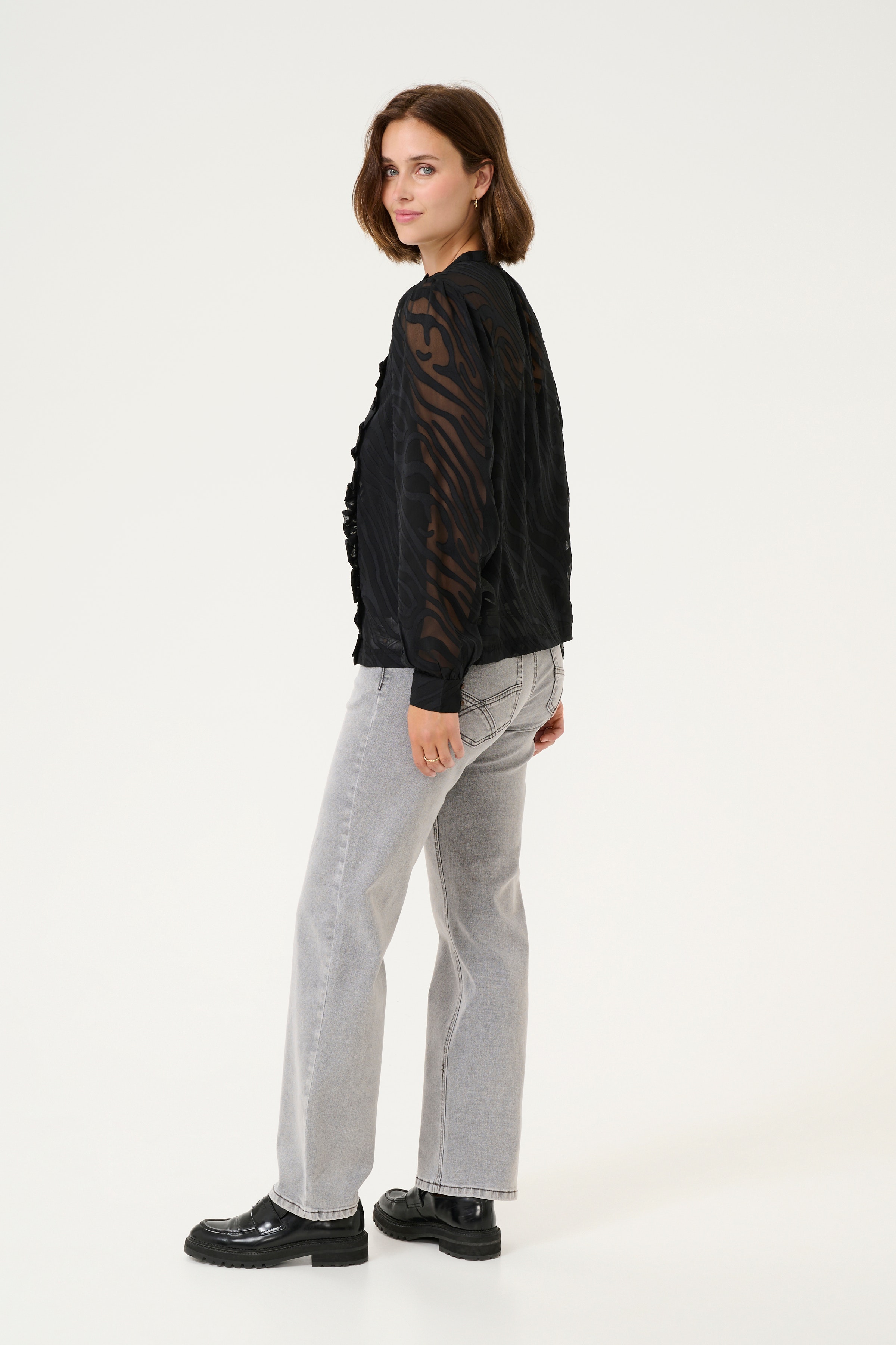 Transparente Bluse mit durchgehender floraler Struktur, gerade geschnitten, Rundhalsausschnitt, Knopfleiste und langen Ärmel mit Bündchenvolumen.