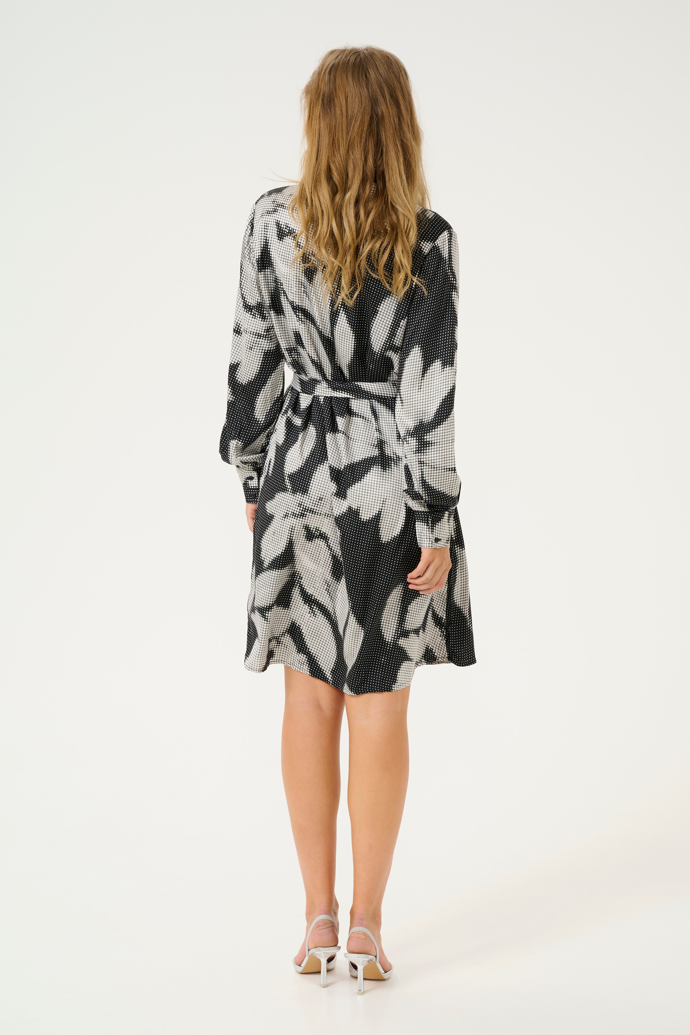 Overhemdjurk met rechte pasvorm, knoopsluiting, klassieke kraag en strikceintuur. Lange mouwen, gestructureerde look en moderne knielengte.