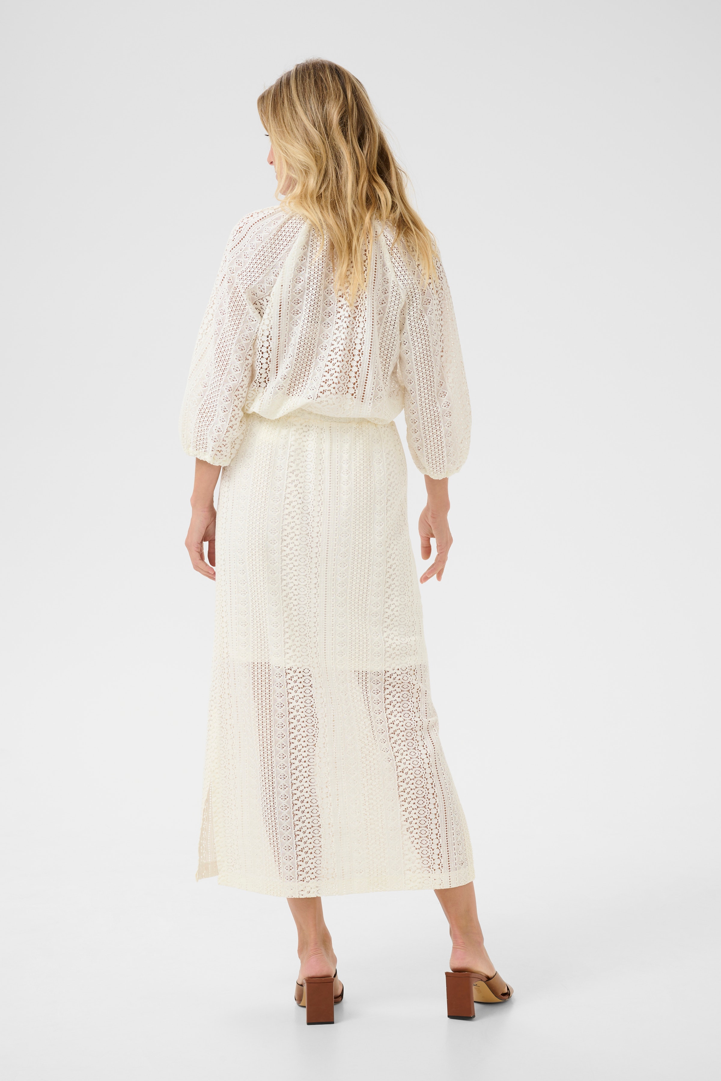 Lång kjol med spetsstruktur, rak passform och mjuk finish. Tydligt skir effekt med delvis foder och resårmidja för bekväm stil.